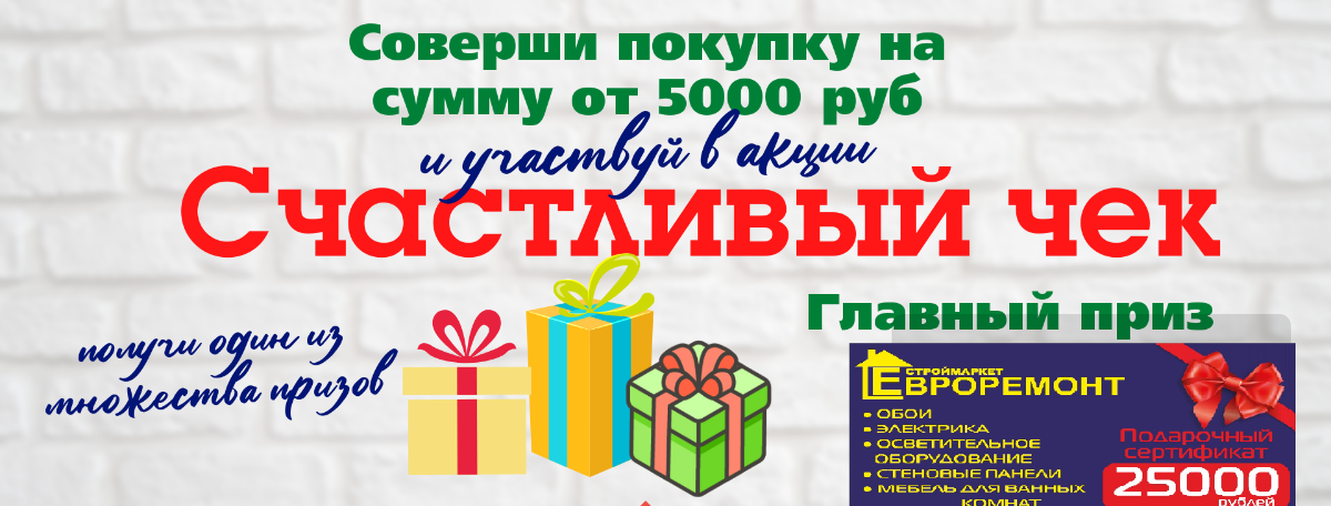В честь приближающегося 25-ти летнего Юбилея строймаркета Евроремонт, мы снова запускаем нашу традиционную акцию "Счастливый чек" !